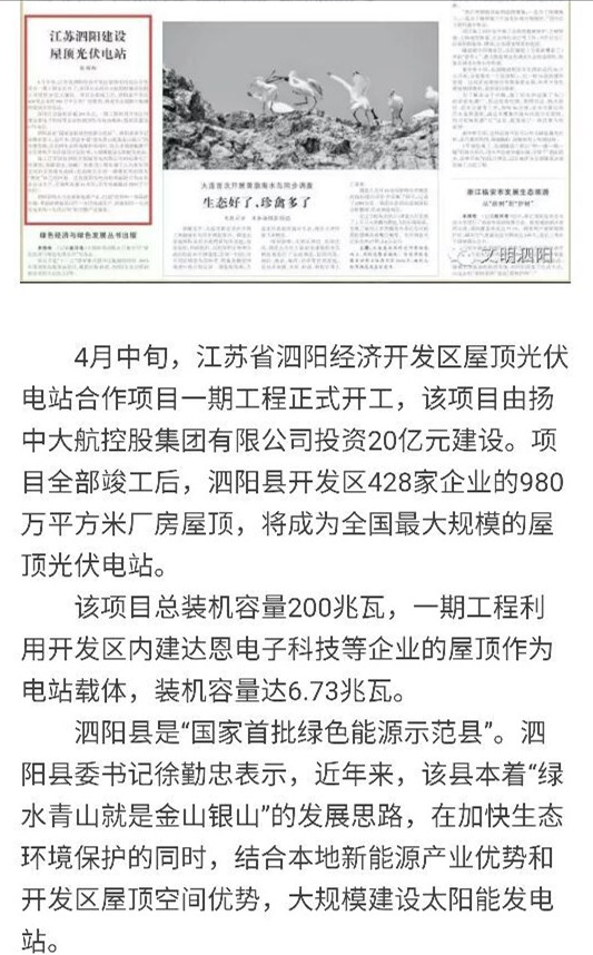 项目全部竣工后,泗阳县开发区428家企业的980万平方米厂房屋顶,将成为全国最大规模的屋顶光伏电站。该项目总装机容量200兆瓦,一期工程利用开发区内建达恩电子科技等企业的屋顶作为电站载体,装机容量达6.73兆瓦。