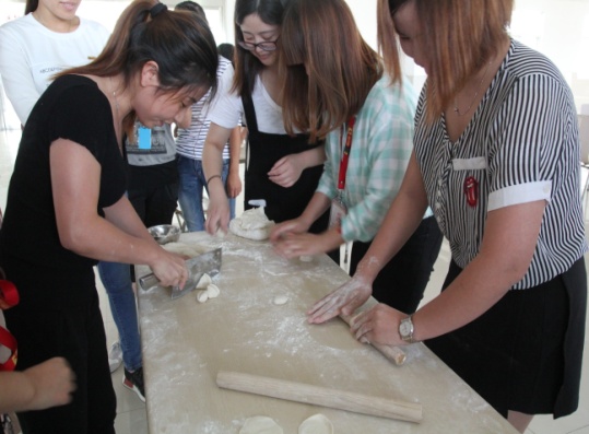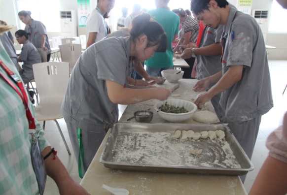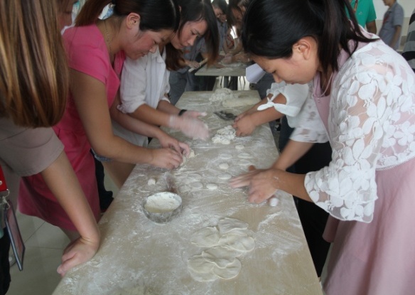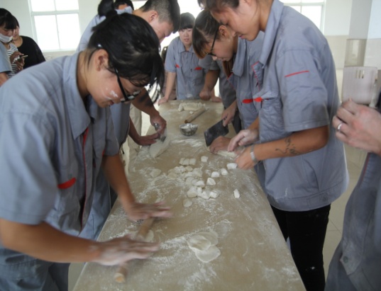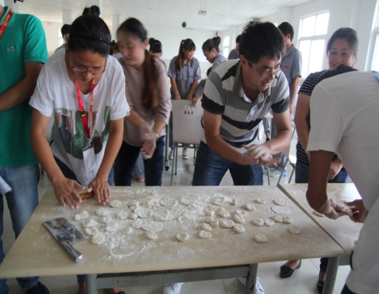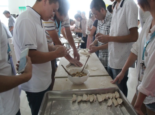 下午14点,按照比赛安排所有成员齐聚食堂,大家都摩拳擦掌跃跃欲试。按照人员名单,共分为10个小组,每个小组选出一名队长进行现场抽签,决定出场顺序和对手。一会儿,食堂工作人员将和好的面和饺子馅端上来,大伙立即着手开始准备,分头行动。材料上来,包饺子比赛立刻上演。包饺子简单,可是擀饺子皮却难住了好多同仁。不过还是有几个同事拿出了让人刮目相看的功力,擀皮又快又圆,值得一提的是其中还有几个是男生。大家边包饺子边不时嬉闹,活动现场时刻洋溢着欢乐。16时左右,包饺子过程结束。看着自己的劳动成果,大家纷纷留出笑容并与自己的作品合影留念。