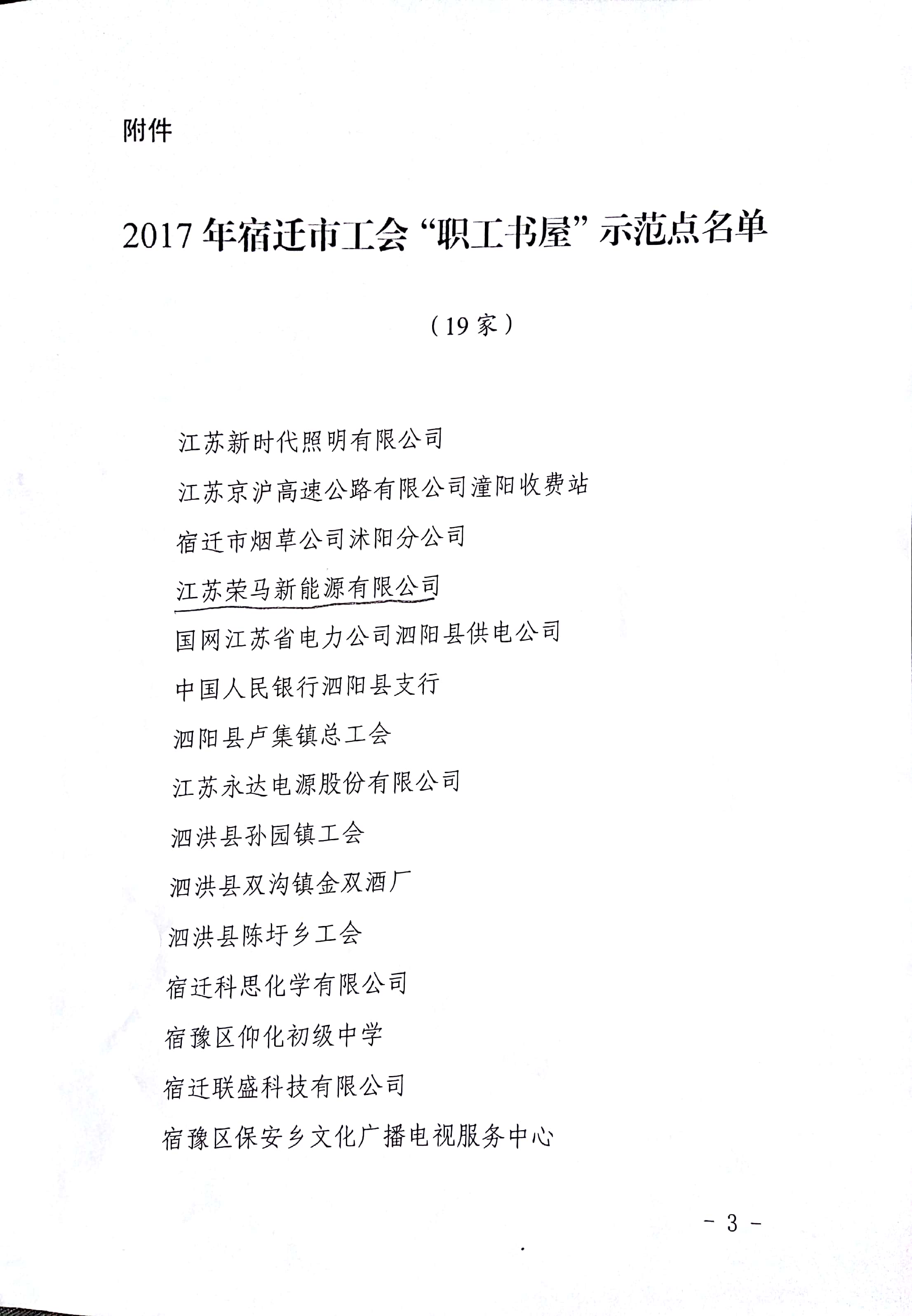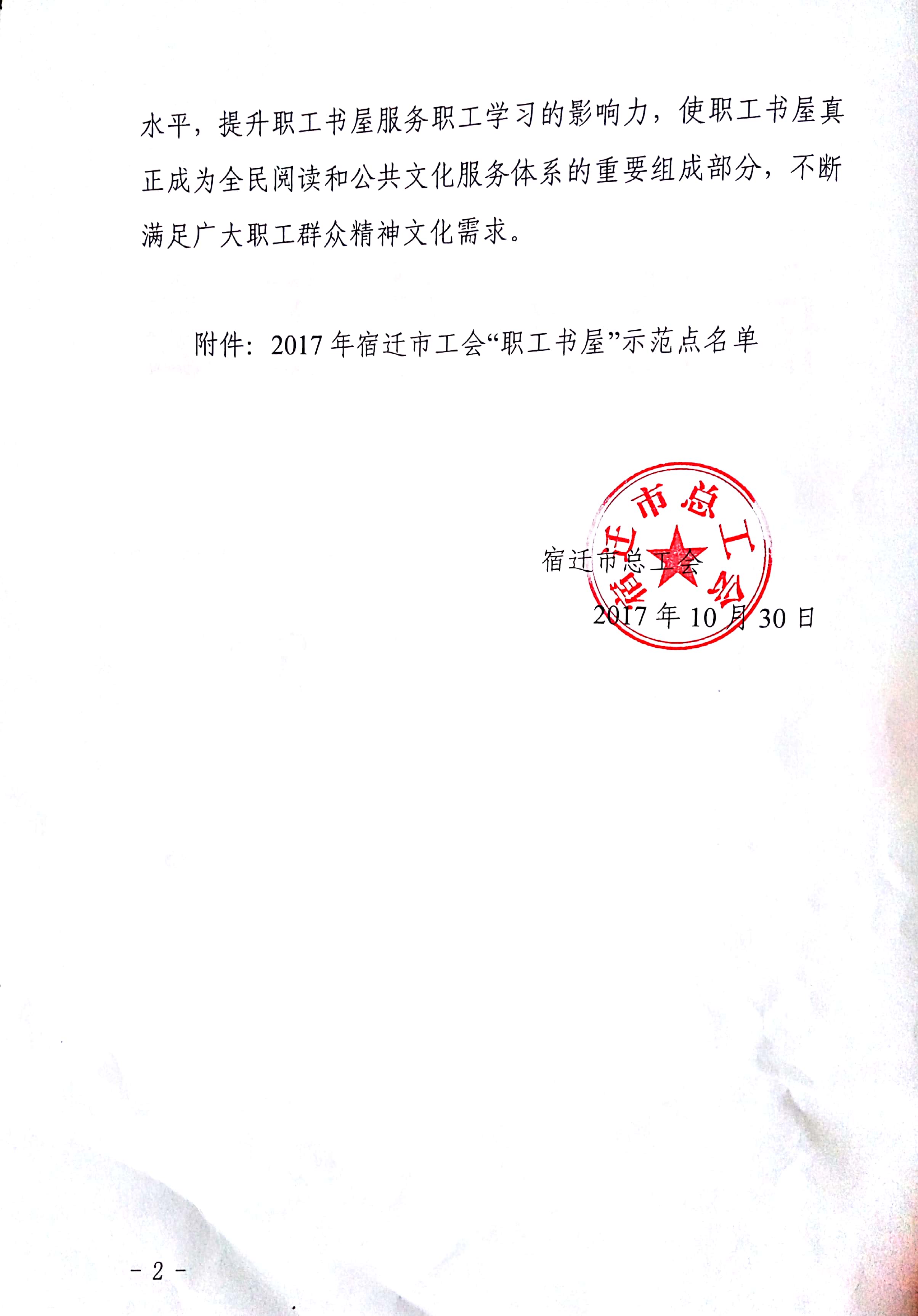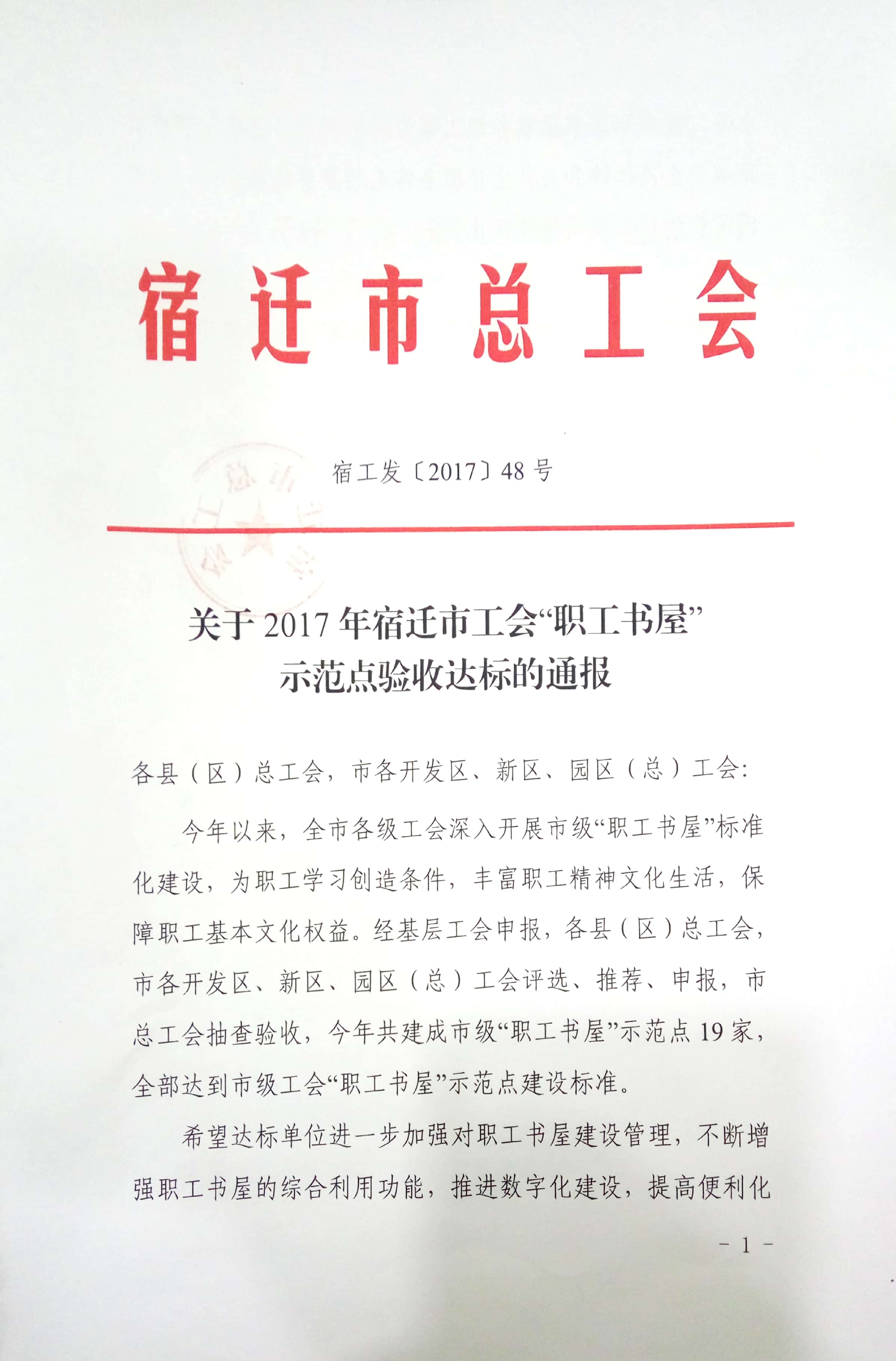 20171030日,经县市各级工会审核批准,我司被授予2017年宿迁市工会“职工书屋”示范点荣誉称号。