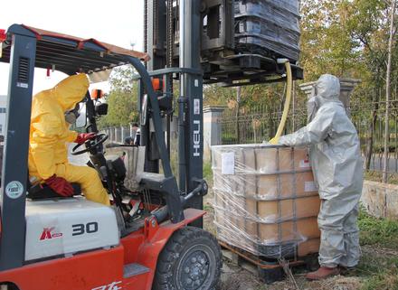 为了防止各类酸碱在正常存储及使用过程中发生不慎泄漏现象,同时充分保证在紧急情况发生时,应急救援能迅速响应,有效的控制事故的发展,保护现场人员和周围人员的安全,将事故对人员、财产和环境造成的影响降低到最低程度,2018年10月19日上午由安委会组织各部门人员在化学品仓库区域进行酸碱泄漏应急演练。