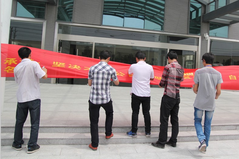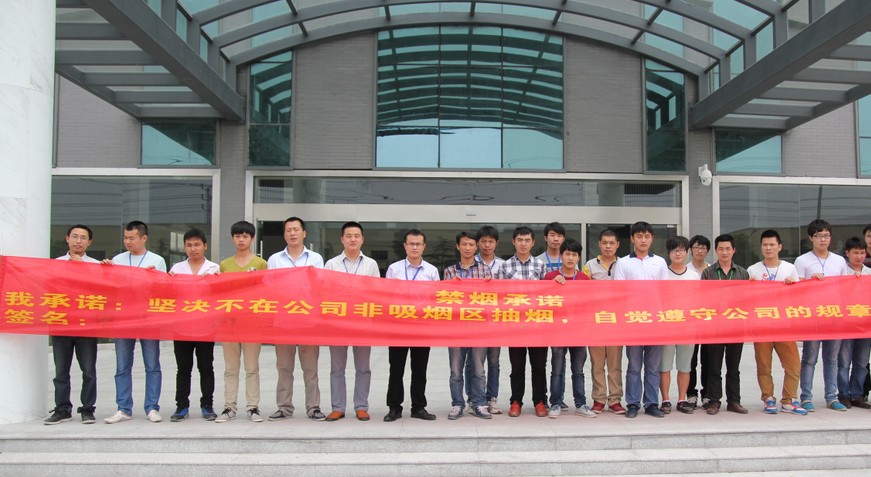 2014620日中午11:00,人力行政部集合各部门人员在办公楼开展“厂区禁烟”宣传活动,技术部何晨旭博士和生产部董小伟经理做了重要发言,再次强调了吸烟的危害以及吸烟所带来的潜在隐患,敲响了安全警钟;活动结束后,大家踊跃在禁烟承诺书上签名。