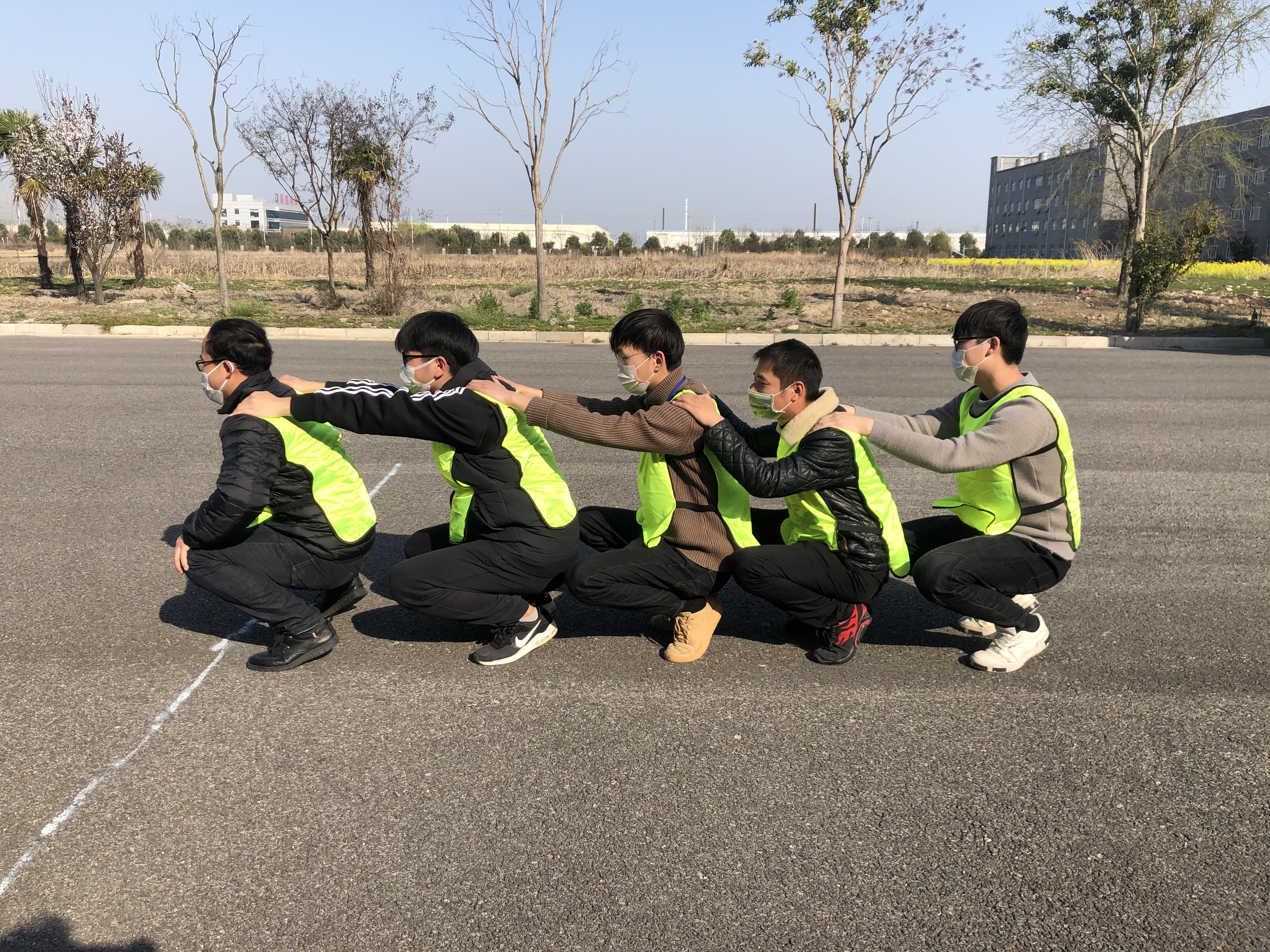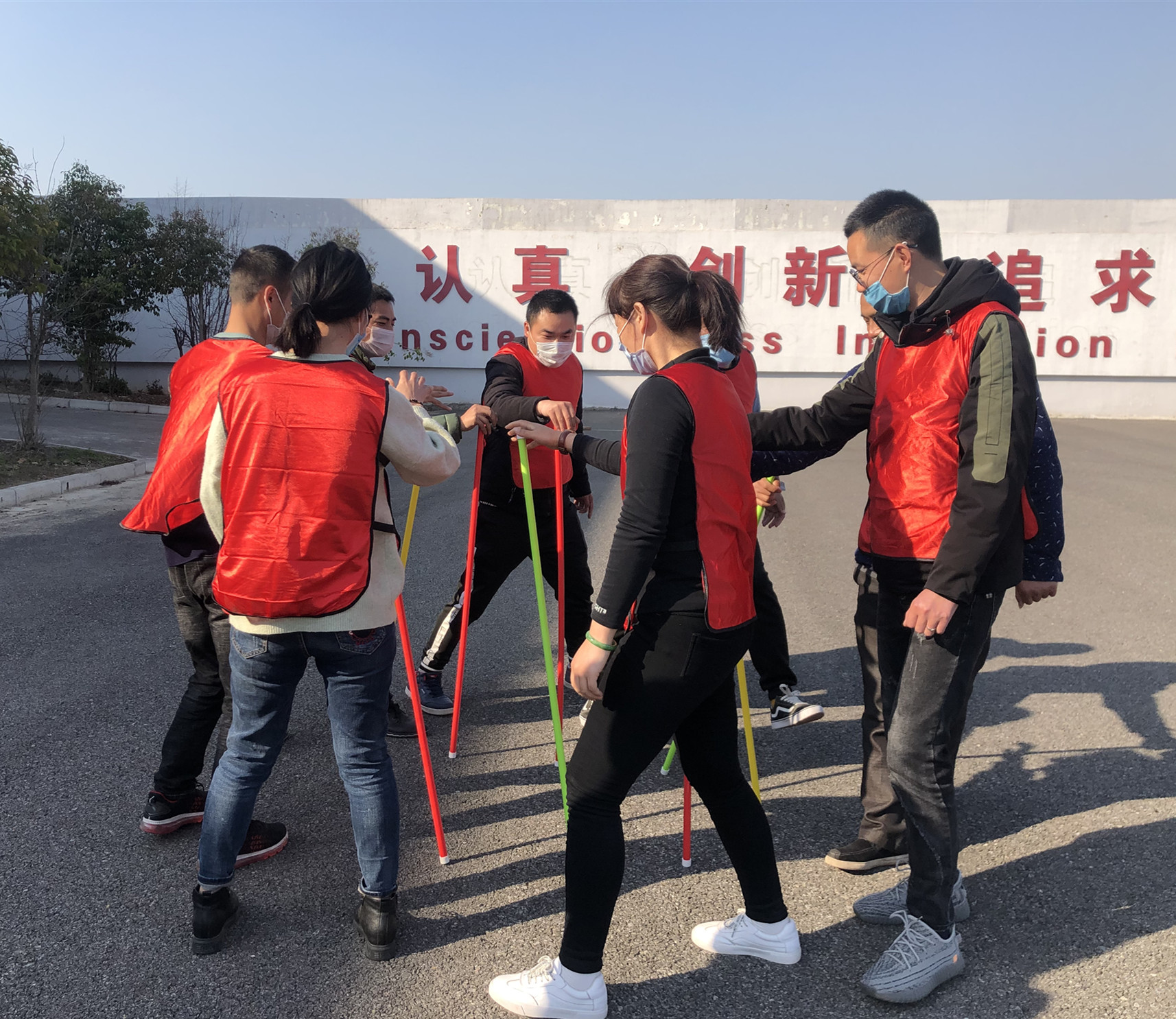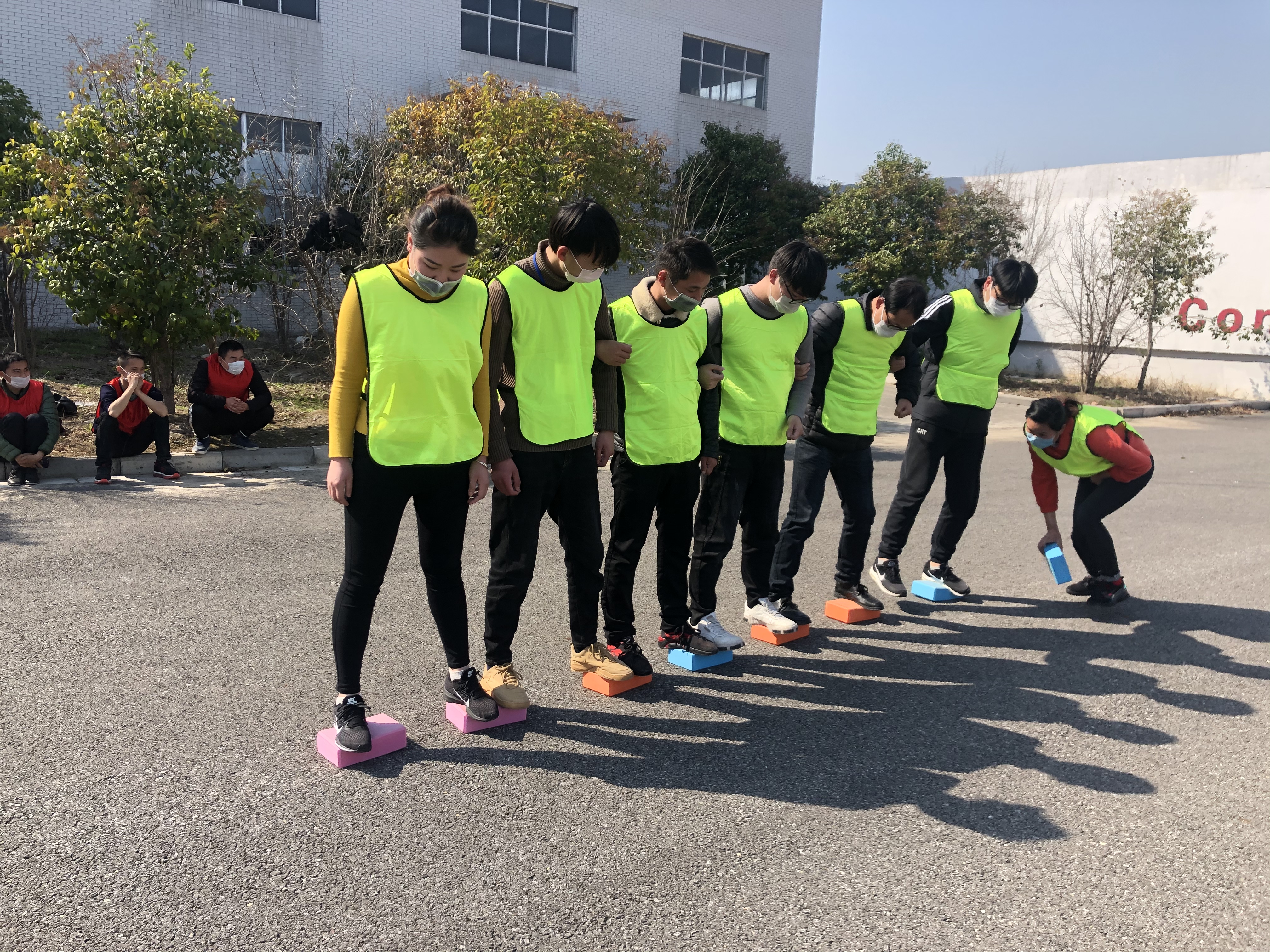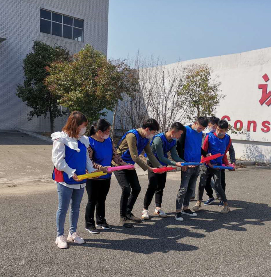下午13:30,人力行政部以“团队建设”为主题,在室外进行拓展活动。24名员工根据队服颜色,决定了队名。新员工都是第一次参加这样的拓展活动,每个人都带着期待、紧张和兴奋的心情,在主持人的带领下开始做拓展活动前的准备活动。