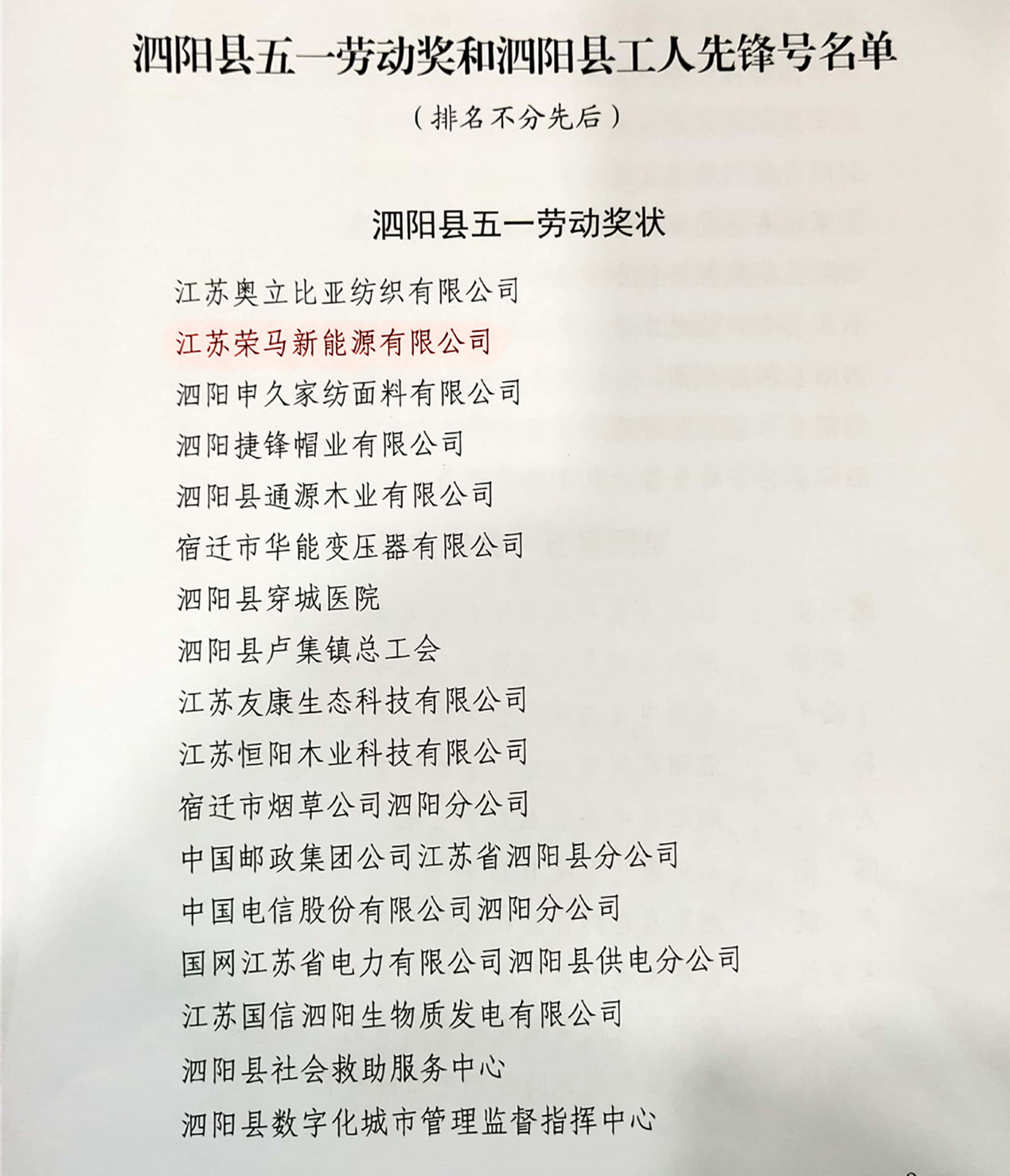 荣马新能源荣获2020年泗阳县“五一劳动奖状”荣誉称号