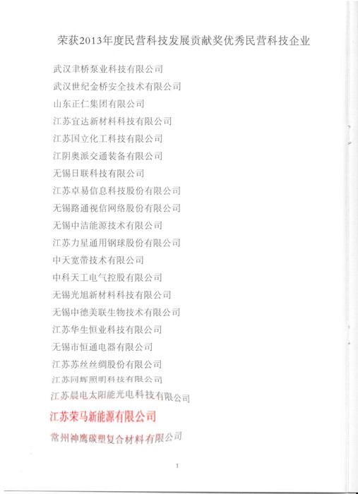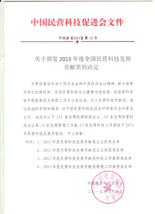 经国家科技部、科学技术奖励工作办公室批准,由中国民营科技促进会评审的2013年“民营科技发展贡献奖”评选结果于近日揭晓,我司荣获“优秀民营科技企业”的荣誉称号。