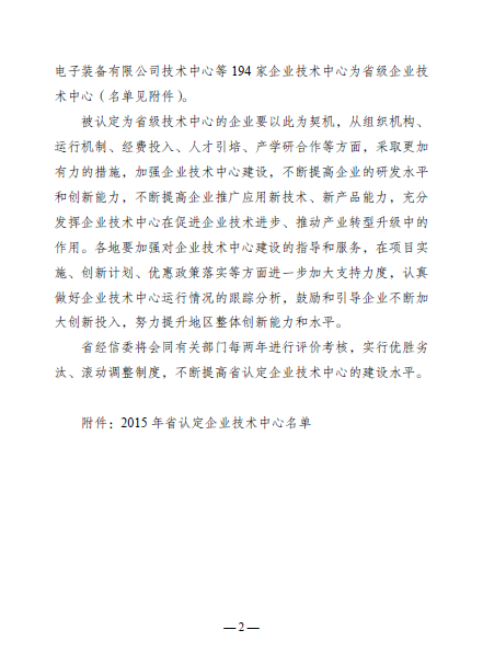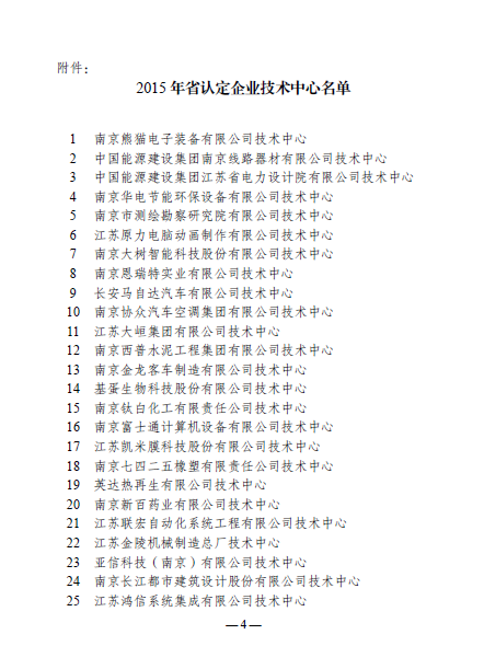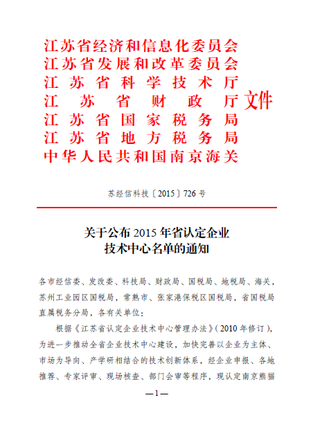 20151103日,江苏省经信委认定小组公示了2015年江苏省企业技术中心名单,我司光荣入围,位序191